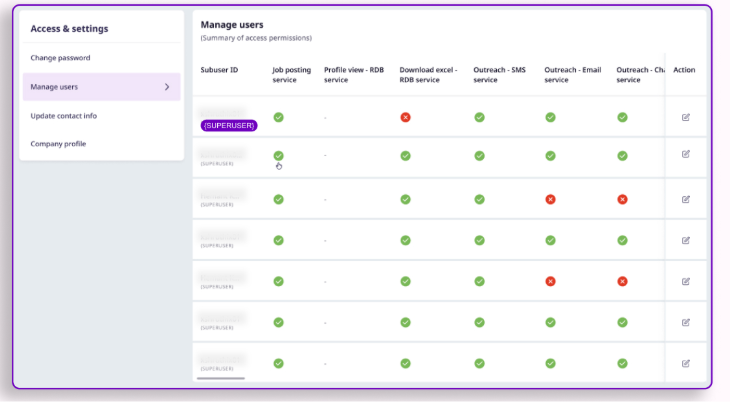 Easily enable or disable services for any login. Whether it is job postings, resume access, or outreach tools, managers decide who gets access and when. This prevents misuse and ensures services are used only where they are needed.